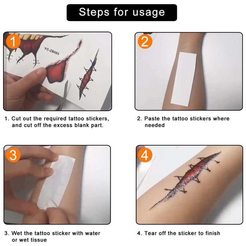 - 【Frighteningly Fun】-- Bleeding wounds, scratch marks, and spooky eyeballs are sure to give your friends a good scare! Choose these horror tattoos to become a vampire, zombie, or any other spine-tingling character, enhancing the thrill of your Halloween experience.
