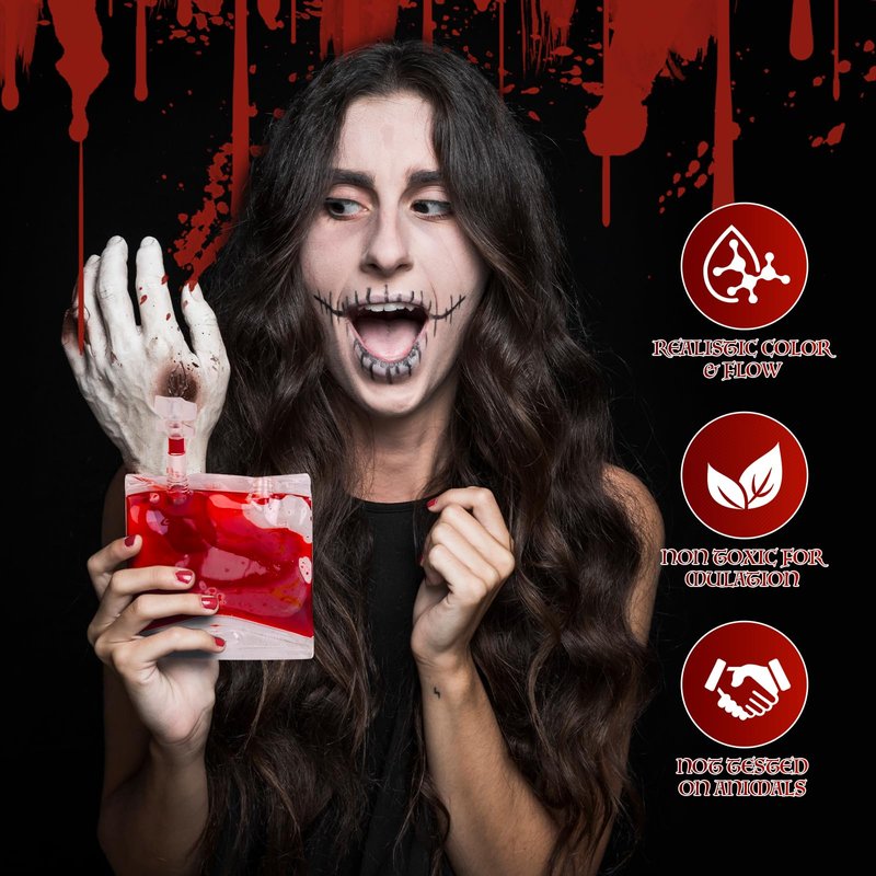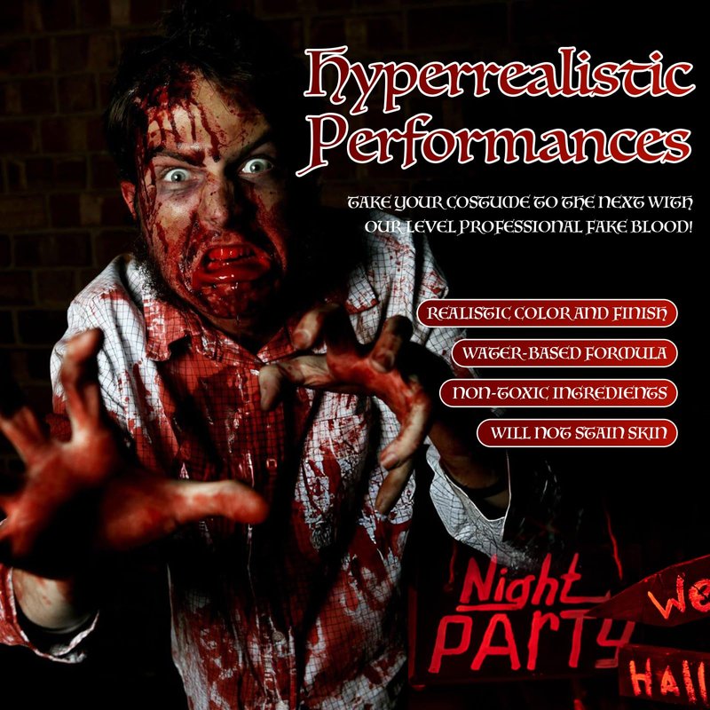 - ✔ Safe Ingredients: Our oil-based fake blood formula like real blood, use high quality non-irritating material, no harm to the skin, ultra-realistic. Can be sprayed on body face, arms and legs, perfect for fake blood makeup, cuts and even wounds!