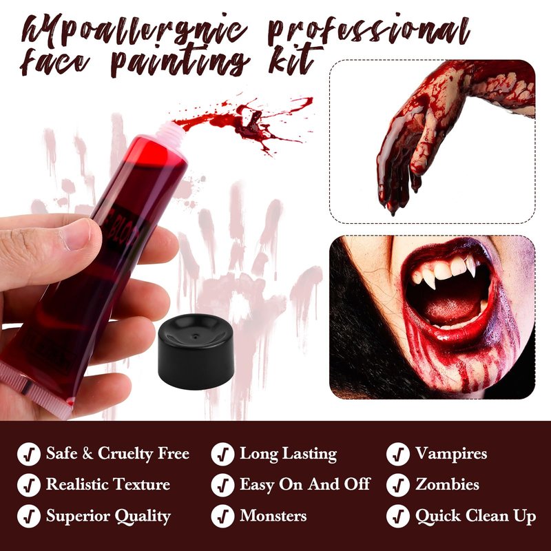 - Easy to Use and Wash: Realistic Fake Blood body paint for Halloween. Squeeze it directly on the area you need.It will run like real blood, and take a while to dry. Easy to wash off with soap and warm water.
