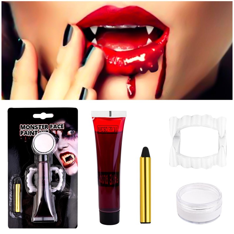 Halloween Fake Blood Washable + Fake Teeth Vampire Teeth + Black and White Face Painting Kit, Drip Liquid Blood for Clothes, Zombie, Vampire Monster SFX Makeup Face Body Paint