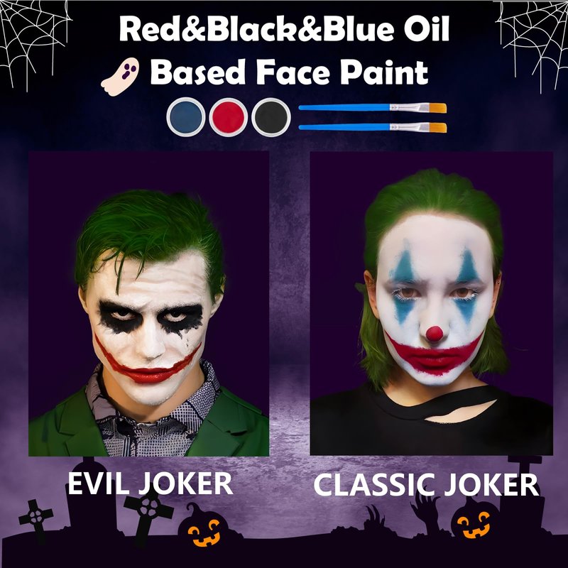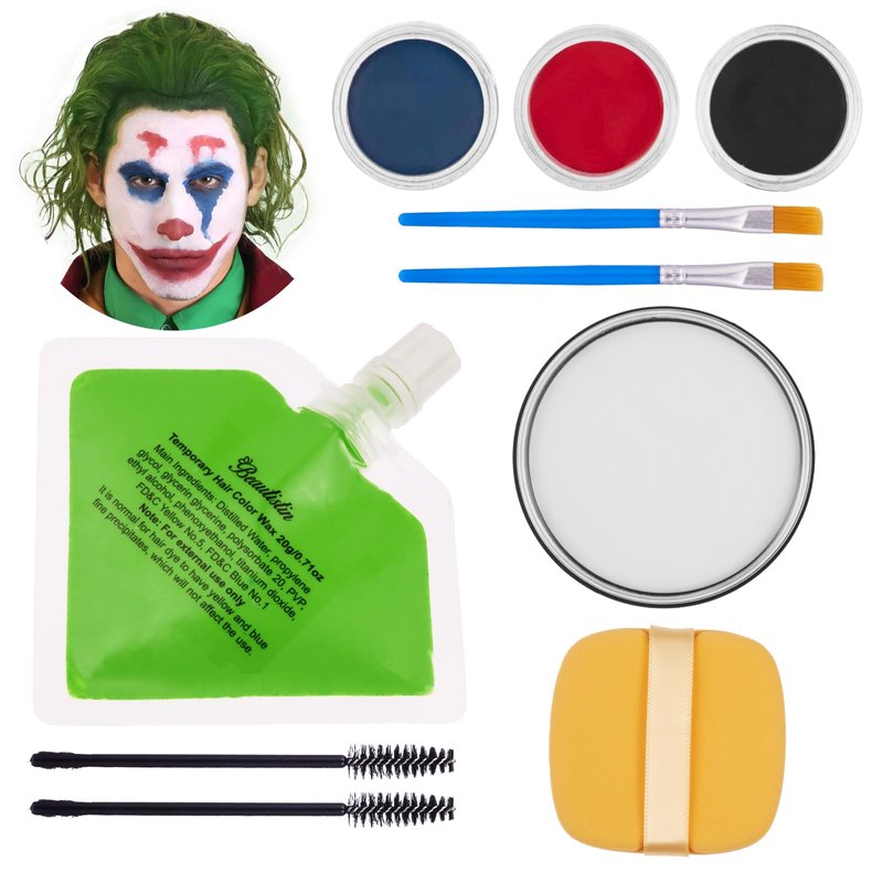 - Joker Makeup Kit: Includes White Red Black Blue oil-based face paints and 20g green temporary hair wax. The 10g/0.35oz white paint comes with a puff for full-face coverage. Red black blue are each 3g/0.1oz, ideal for eye and lip makeup with brushes