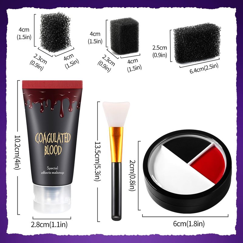 PACKAGE INCLUDES: 3 Color White Black Red Face Body Paint 17g(0.59oz)* 1 pcs, Edible Fake Blood Gel 30g(1.06oz)* 1 pcs, Sponge* 3 pcs, Brush*1 pcs