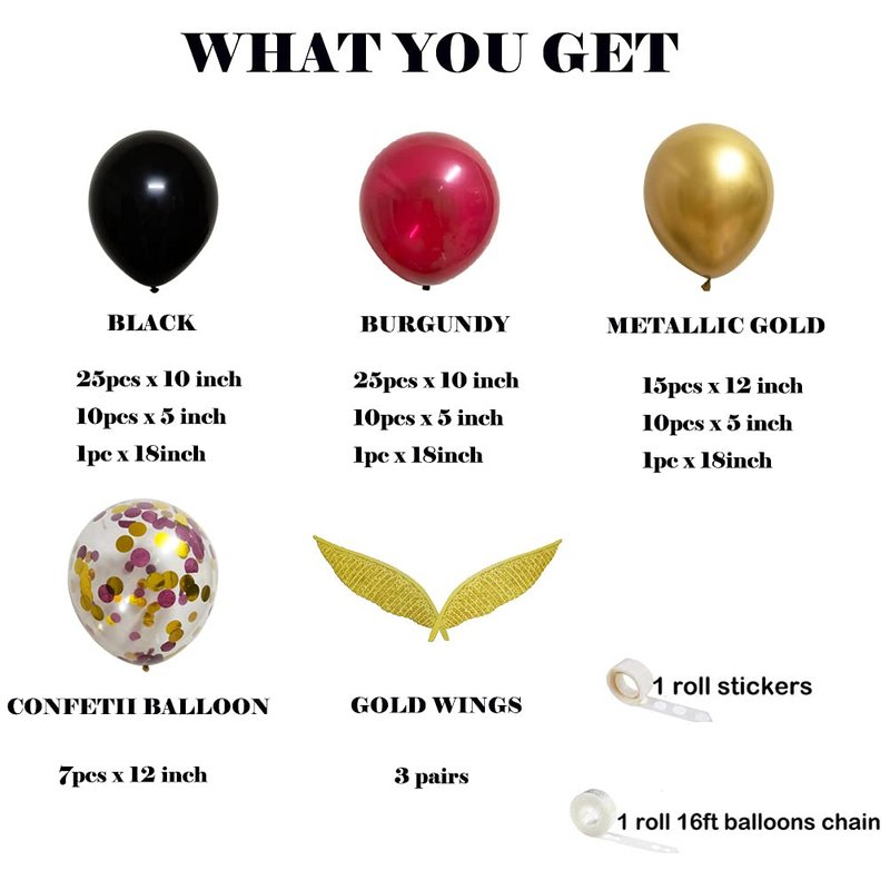 - [UNIQUE IDEA] - We mix many elements of magic school to put up a balloons garland. 50pcs 10 inch latex balloons( Black/Burgundy). 15pcs 12inch Metallic Gold balloons. 30pcs 5 inch balloons(Metallic Gold/Burgundy/Black).3pcs 18inch latex balloons(Gold/Black/Burgundy).7pcs 12inch Confetti balloons. 3 pairs of golden wings. 1pc balloon arch chain. 1 roll of glue dots.