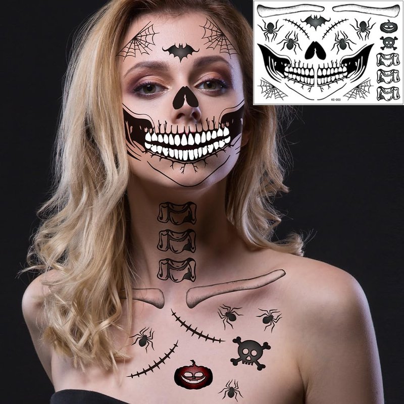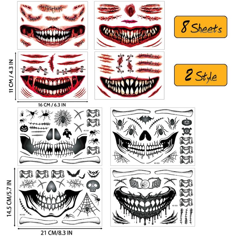 - 【Stylish Designs Halloween Tattoos】: These Halloween tattoos offer a variety of creative and stylish designs skeleton mouth scary face tattoos. 8 Sheets Tattoos are great for the whole family.