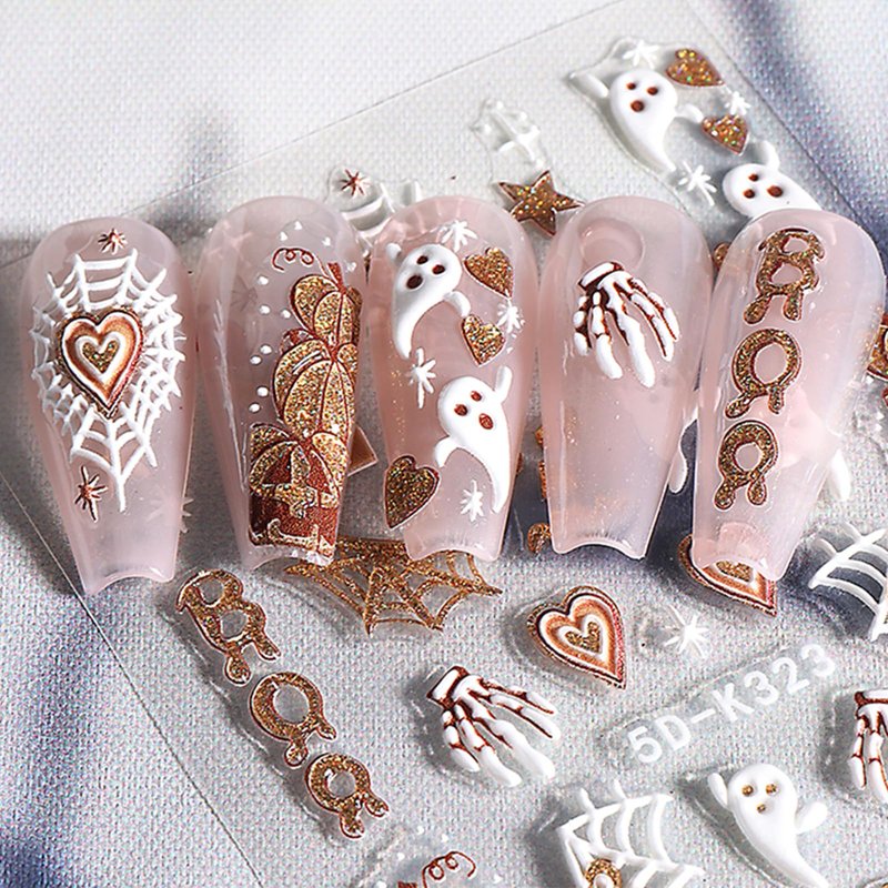 5D Halloween Nail Art Stickers Decals Horror Bone Ghost Embossed Design Nail Charms for Women Girls Manicure Tips Decorations