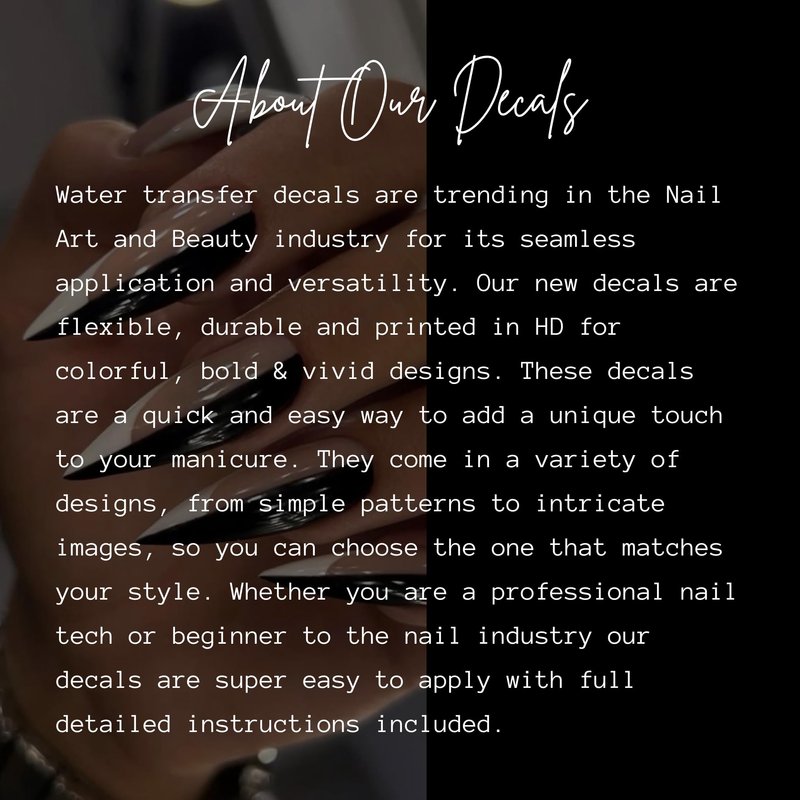 Water transfer decals are trending in the Nail Art and Beauty industry for its seamless application and versatility. Our new decals are flexible, durable and printed in HD for colorful, bold & vivid designs. These decals are a quick and easy way to add a unique touch to your manicure. They come in a variety of designs, from simple patterns to intricate images, so you can choose the one that matches your style. Whether you are a professional nail tech or beginner to the nail industry our decals are super easy to apply with full detailed instructions included.