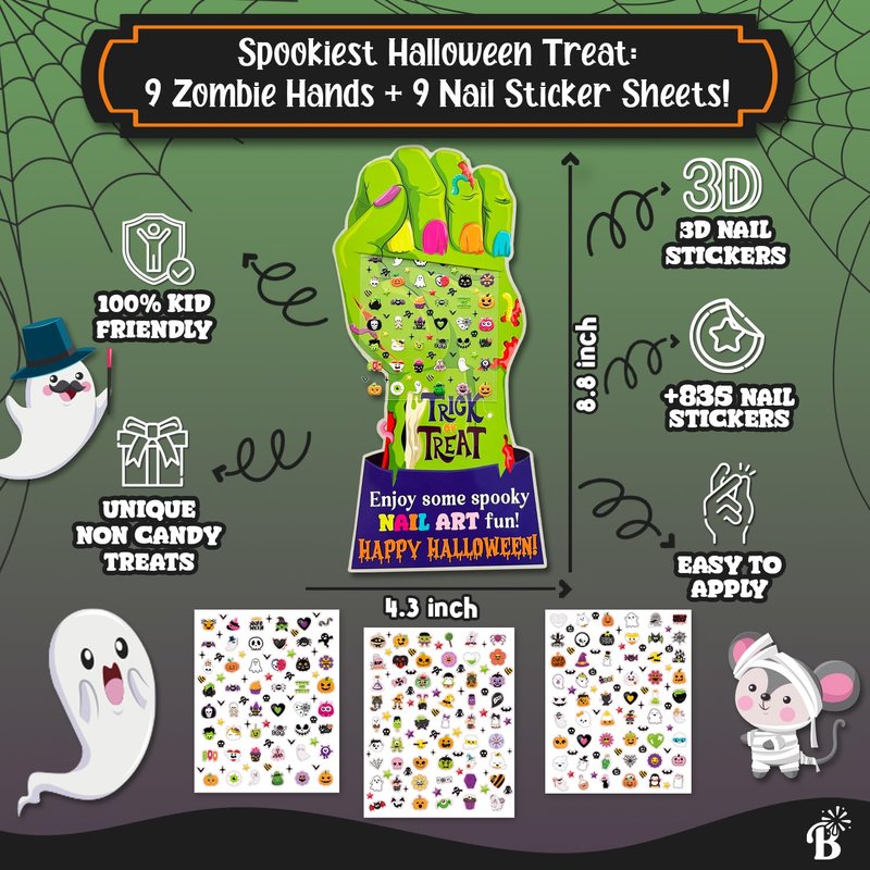 - 👻 Perfect Party Favors & Prizes for Girls: Whether it’s a Halloween party, prize, or a fun gift for friends, these zombie hand cards are a hit! Each pack has 9 zombie hand cards (8.8 x 4.3 inches) and 9 nail sticker sheets (3.5 x 2.8 inches), with around 93 adorable and spooky stickers per sheet.