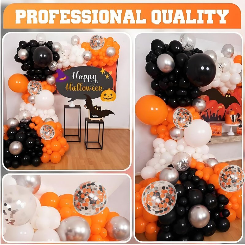 • HALLOWEEN BALLOONS PACKAGE: This black orange balloons set include :15 pcs black balloons, 15 pcs orange balloons, 15 pcs white balloons, 5 pcs black orange confetti balloons, 2pcs balloon ribbon. decorating for your Halloween bash has never been easier! Simply inflate the Halloween balloons and scatter them around the venue for an instant transformation. Create balloon bouquets, arches, or backdrops with ease, and impress your guests with minimal effort.