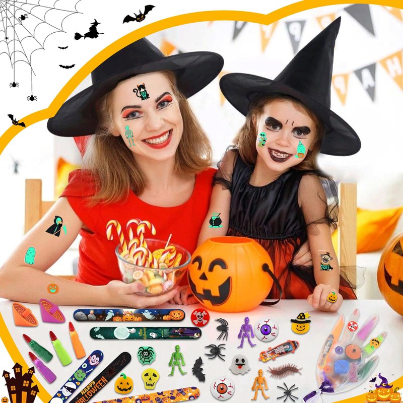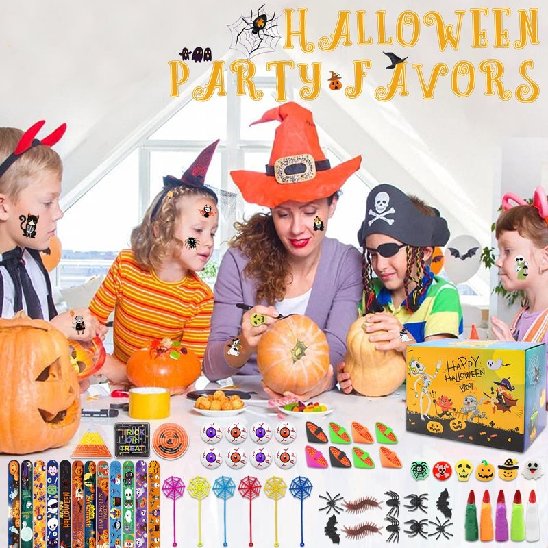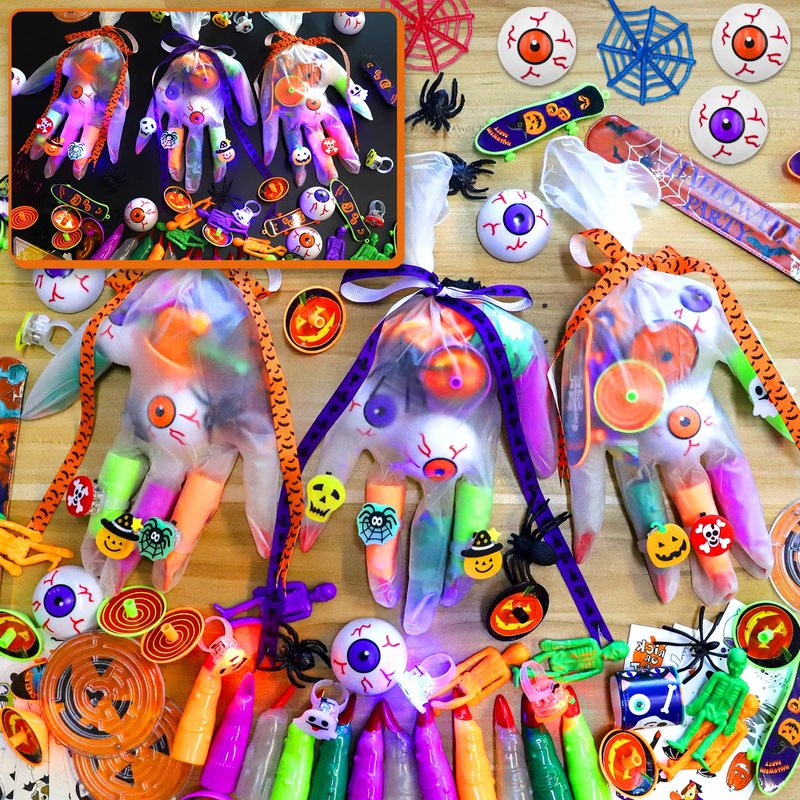 - Halloween Party Favors: Halloween favors wide range of toys includes 12pcs Halloween gloves, with 2pcs exquisite gift rope, as well as accessories for 12pcs elastic spider web, 12pcs ring, 30pcs maniphalanx, 12pcs insect, 12pcs slap bracelets, 12pcs tattoos stickers random, 12pcs elastic skull, 12pcs finger skateboard, 12pcs pull-back vehicle, 12pcs clap ring, 12pcs spinning top random, 6pcs maze toy, etc.