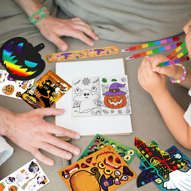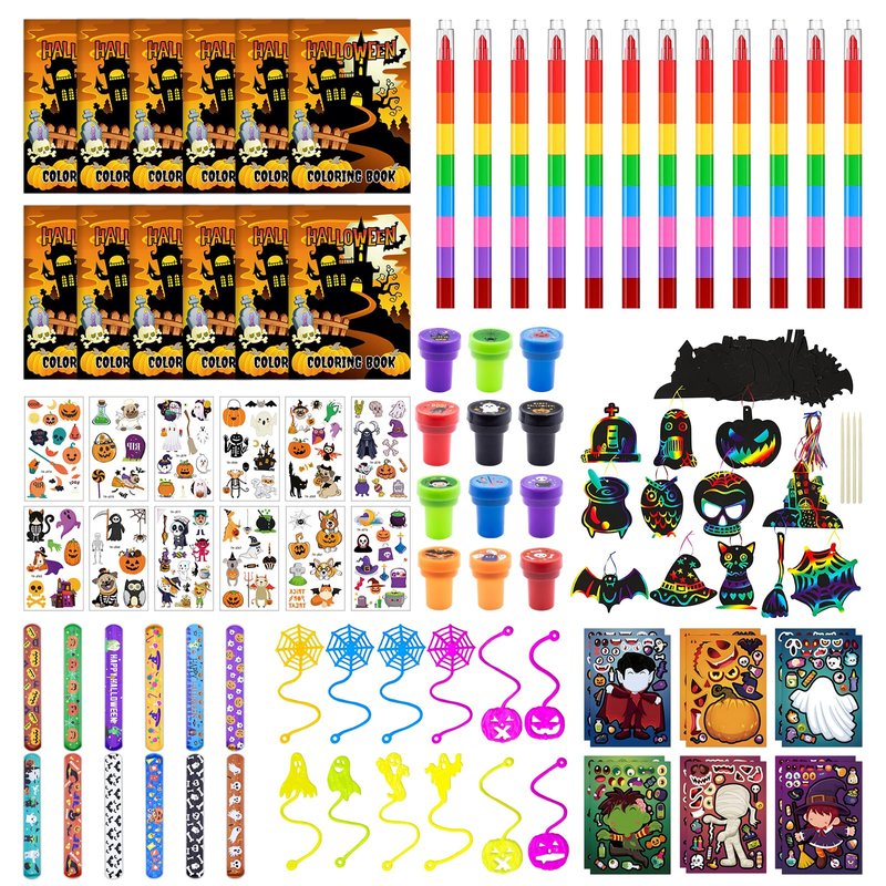 - Halloween Party Favors Set: our halloween party favors set includes 12 coloring books(12 pages per book), 12 rainbow stacking crayons(8 colors),12 tattoos, 12 stampers, 12 DIY art craft stickers, 12 slap bracelets, 12 sticky hands (different styles), 12 scratch art paper, sufficient quantity, and various styles enrich your trick or treat party