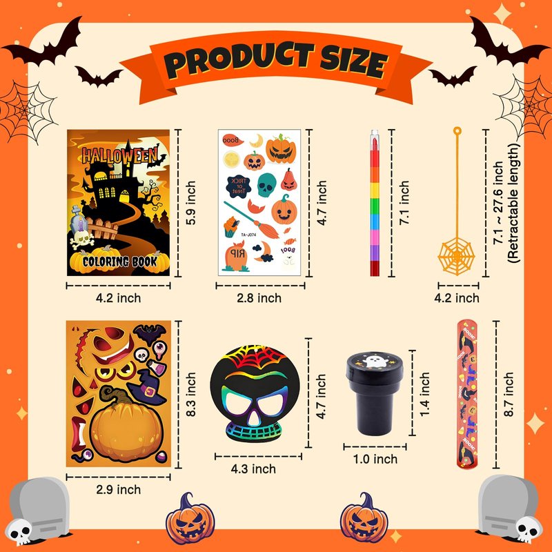 Size: Halloween party favors coloring books is about 4X6 inches,tattoo stickers are about 2.68 x 4.72 inches, and 8 different colors stacking crayons is about 7 inches,stampers are about 1 x 1.38 inches,DIY sticker is about 4 inch, slap bracelets is about 8x1 inch