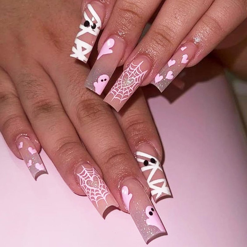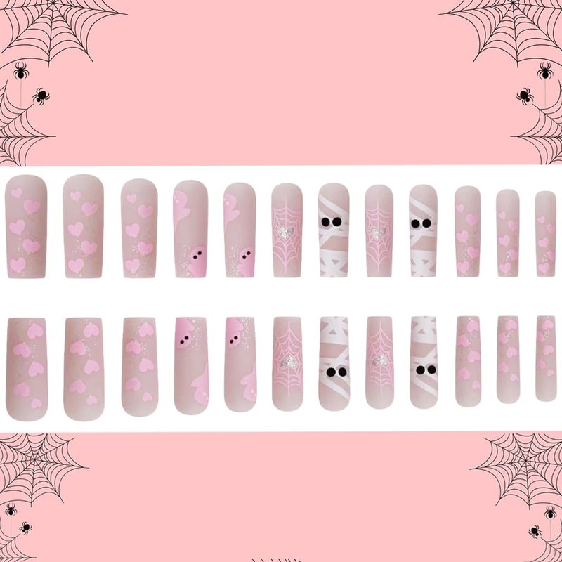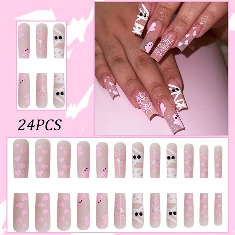 Halloween Press on Nails Long Coffin Fake Nails Halloween Cute Ghost Heart with Glitter Design Glossy Acrylic Nails Full Cover Nude False Nails Holiday Manicure Accessories kit for Women and Girls