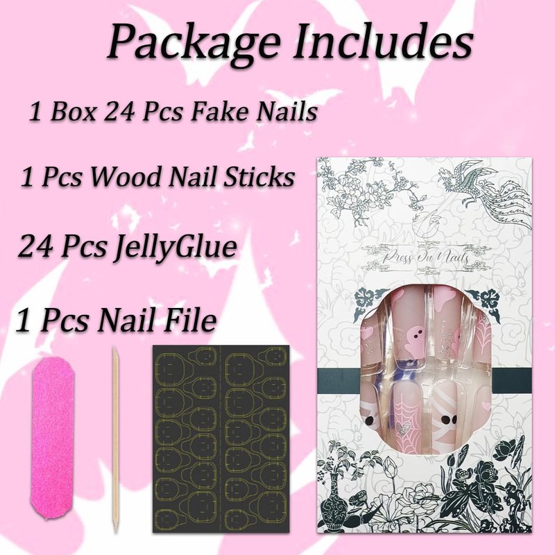 - Package Contains: You will get 24 pieces ghost false nails in 12 sizes,1 piece nail file, 1 piece nail double-side stickers, 1pcs wooden stick for removing nails tips;There are 12 different sizes of fake nails; You can choose the most suitable fake nails for yourself