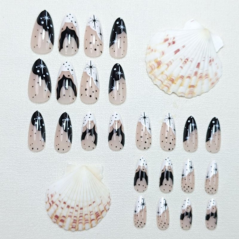 Halloween Press on Nails Medium Almond French Tip Fake Nails White&Black False Nails with Designs Bats Stars Glossy Glue on Nails Full Cover Acrylic Cute Artificial Nails for Women Manicure 24 Pcs