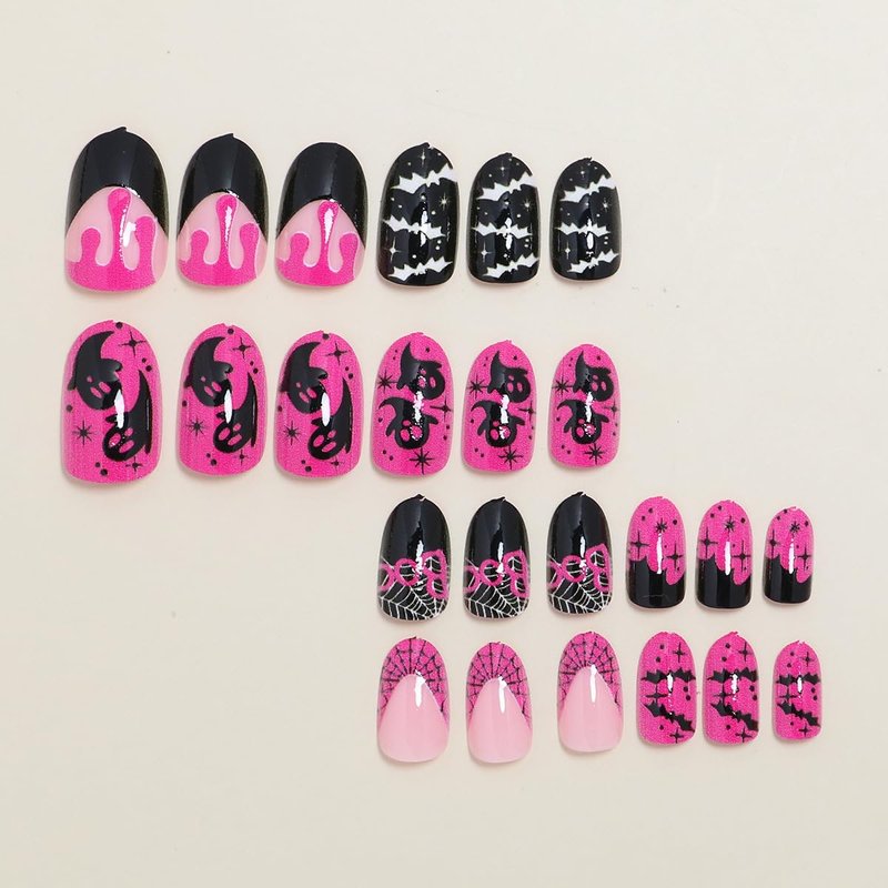 Halloween Press on Nails Medium Almond - Pink Black French Fake Nails Pink False Nails Press ons With Ghost Bat Spider Web Design Full Cover Acrylic Nail Tips Glue on Nails for Women Girl 24Pcs