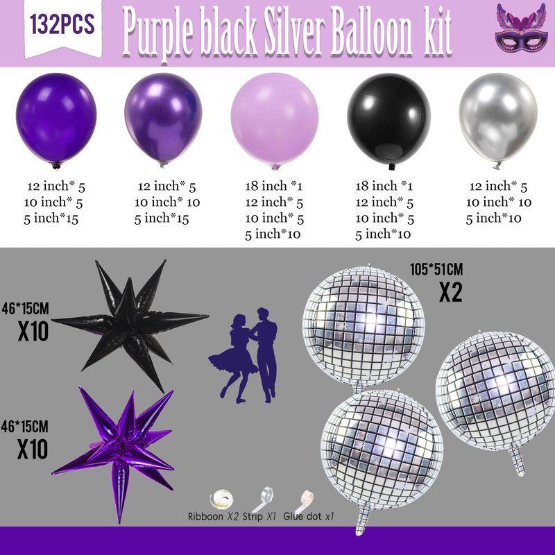 - 【Purple and black Balloon Set】Includes the following 132 balloons in different sizes 5"10"12"18". We chose dark purple, pastel purple, metallic purple, black and silver balloons as the theme palette, and added 22" 4D Disco, black, purple star foil balloons and glue dot chains to create a cheerful and energetic atmosphere for you Atmosphere to make your birthday party more perfect