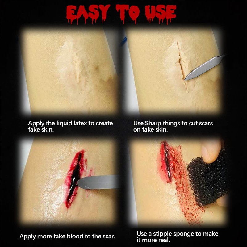 - [Perfect combination] Human Blood Super Value Set, human blood and latex, you can use these two professional products to achieve special cosmetic effects, such as abrasions, small and large cuts, deep blood wounds, torn skin, warts and scarred skin. If you use a makeup sponge and spatula, you can become a good zombie vampire makeup faster and easier.