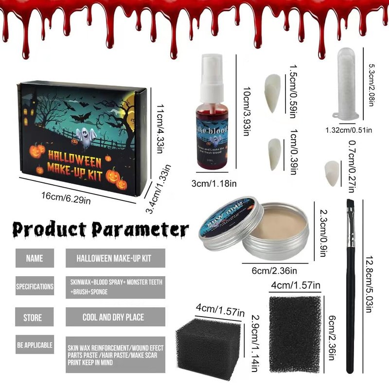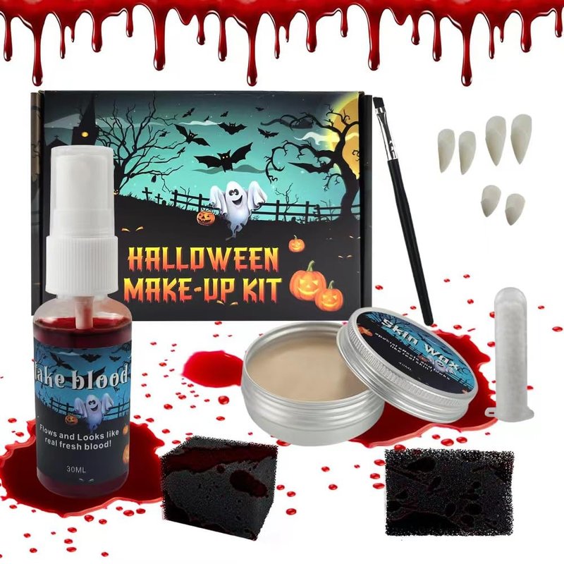 - Halloween Special Effects Vampire Blood and Fangs Makeup Kit With 2 black stipple sponge + 1 makeup wax + 1 Fake blood + 3 Fangs Fake Teeth + 1 Tube Teeth Pellets Adhesive Costume Accessory + 1 brushes