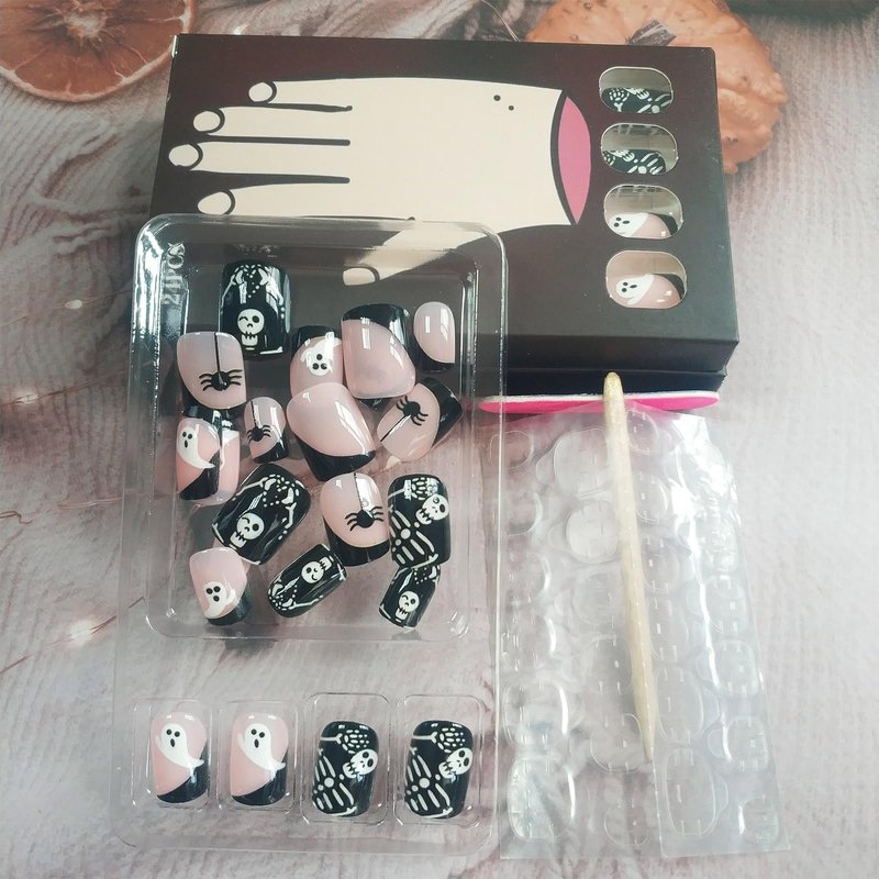 - Halloween Skeleton Skull Press on Nails - Packaged with 24pcs fake nails, 24pcs jelly glue stickers, 1pc nail file, 1pc wooden stick. 12 sizes fake nails can repeated use, suitable for different size of nails. (Durability of jelly glue is not as good as liquid glue, but it makes fake nails reusable. Jelly glue can last about 3 days or more, glue remains longer.Please use your suitable glue according to different scenes)