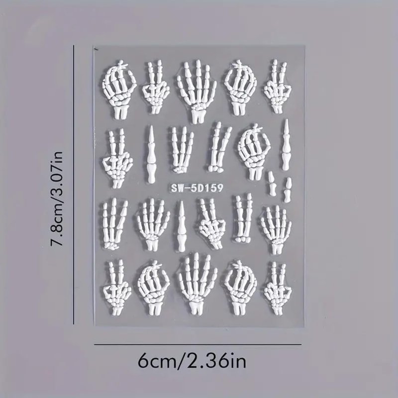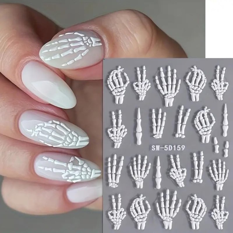 Halloween Skull Nail Art Stickers Skeleton Bones Nail Art Decals 3 Sheets 5D Embossed Finger Skull Nail Stickers Self-Adhesive Hand Bones Nail Sliders Halloween DIY Manicure Supplies for Women Girls