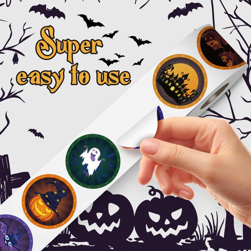 Halloween Stickers for Kids Bulk 500Pcs, Round Halloween Sticker Roll for Treat Bags, Gift Bags, Envelope, Party Favors, 1.5-Inch Small Halloween Stickers with 8 Vibrant Colors & Designs