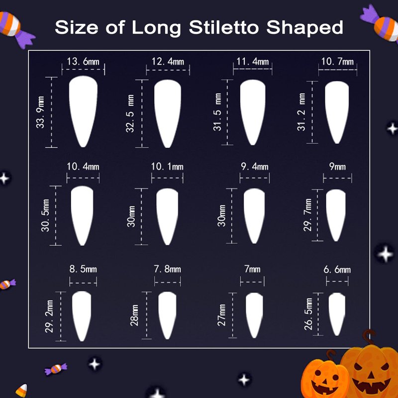 - How to Use? - BAOYAALIN long stiletto Halloween glue on nails for women in 12 sizes to meet different size people's needs. Choose fit false nails and stickers, stick them, and press them on. Without waiting at the nail salon, easily stick on nail salon at home. The acrylic full-cover Halloween fake nails for women are reusable