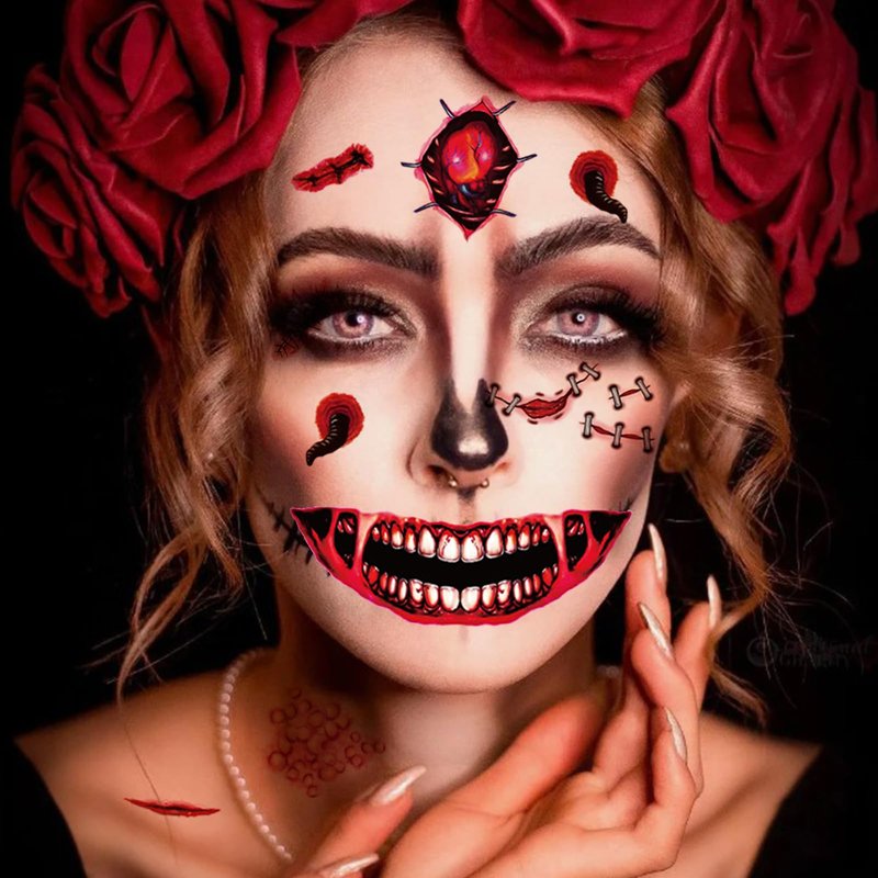 Halloween Temporary Horror Scary Mouth Zombie Skull Red Tattoo Stickers Women Adults Makeup Face Art Decorations Accessories Day of The Dead Party Props 10 sheets