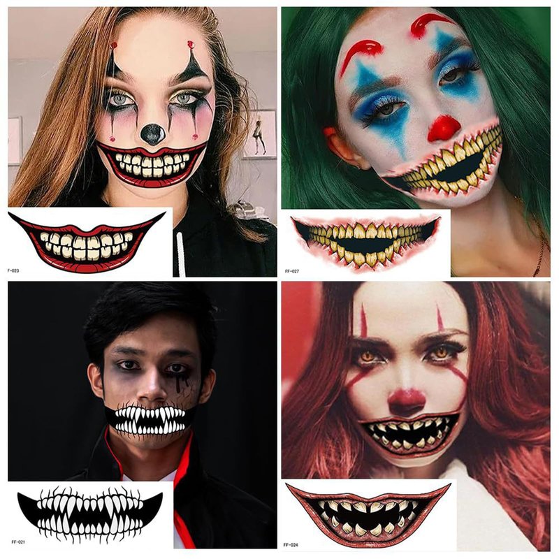 Halloween Temporary Tattoos 10 Sheets Horror Clown Mouth Fake Tattoo Stickers Halloween Waterproof Bloody Prank Makeup Face Decals Masquerade Prank Props for Halloween Party Supplies Decorations