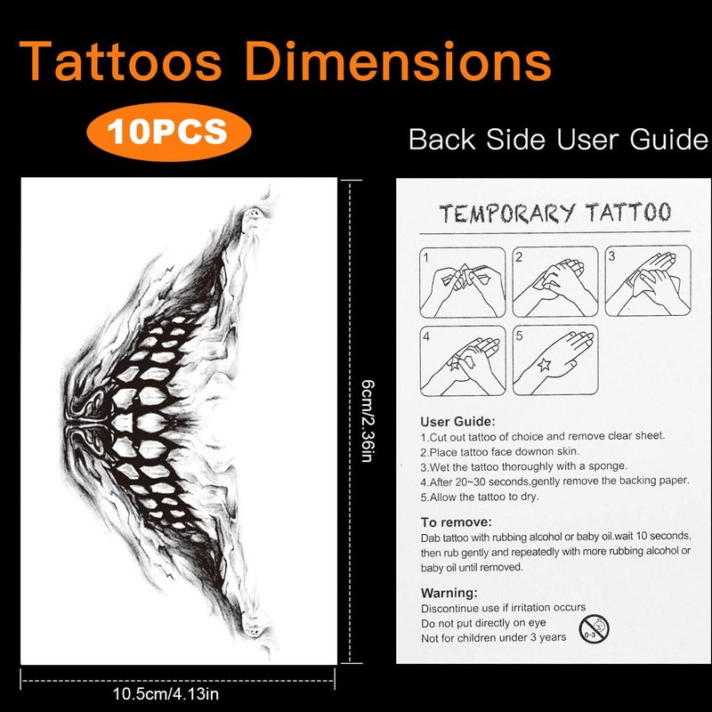 - 👻How to Use:The self-adhesive design is easy to use. You only need to completely soak the paper with clean water, wait 15-30 seconds, and then peel off the white backing paper to have a cool tattoo.