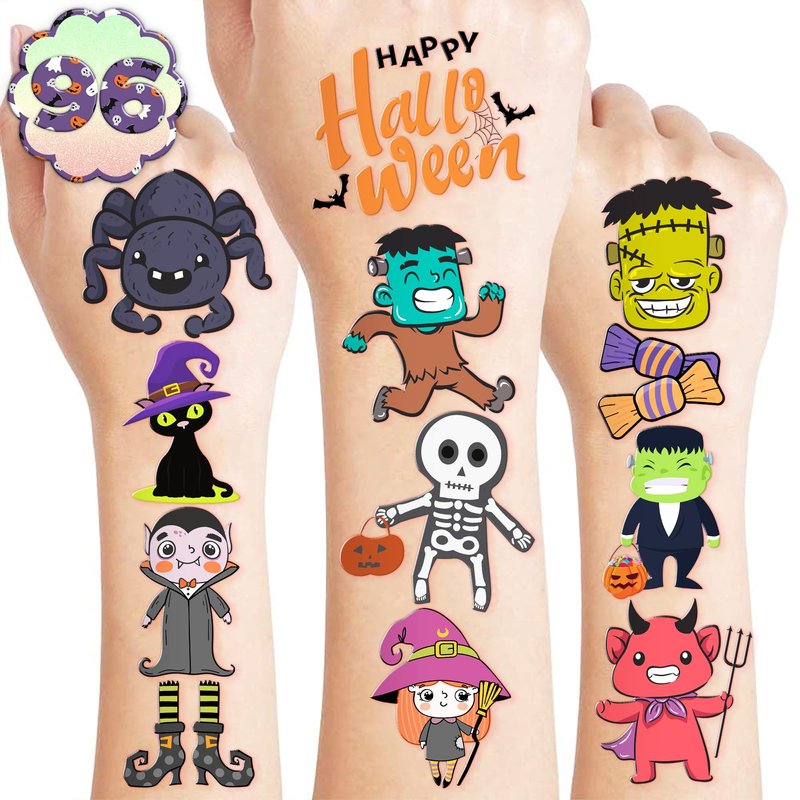 - đăIDEAL TATTOOS FOR THEMED FUNNY HALLOWEEN DECORă: This set of temporary Funny Halloween-themed tattoo stickers comprises 8 sheets in total, featuring a total of 96 adorable, distinct designs. They are excellent for distributing as party favors and small gifts with a Funny Halloween theme for holidays. Each sheet measures 6.1 * 3.1 inches, making them suitable for kids of all sizes.
