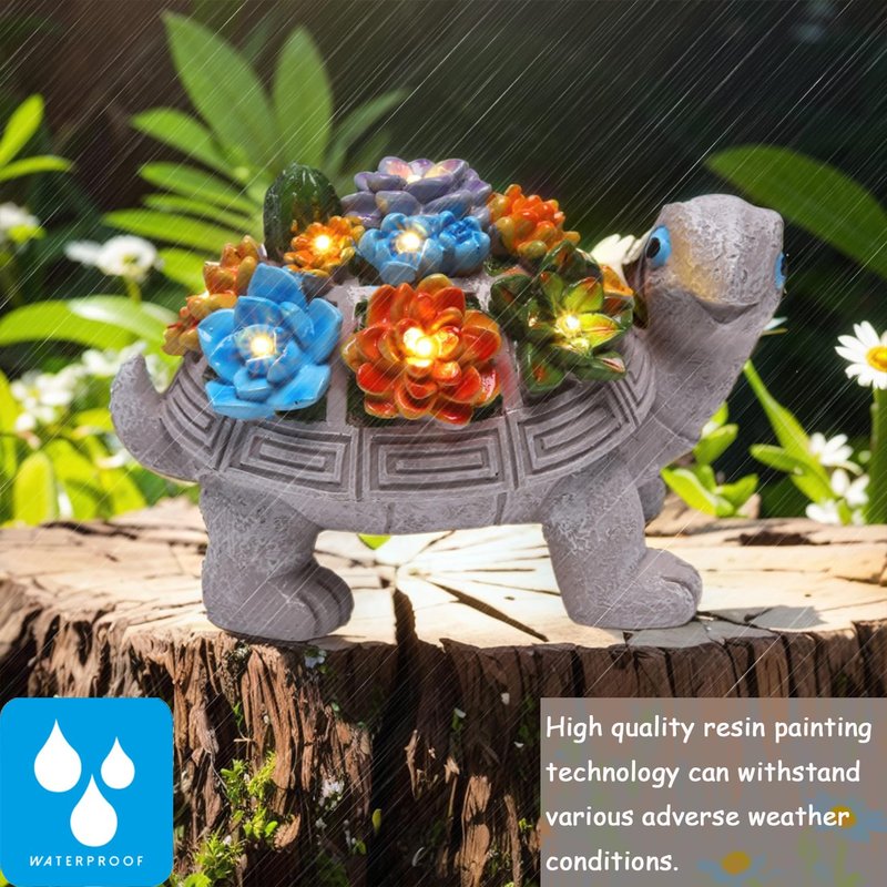 - 馃悽 Turtle Garden Statue:The solar garden turtle has a cute and friendly expression. The turtle鈥檚 head is extended and its with a smile. It looks like it is welcoming your guests or enjoying the view. The shell of this solar powered turtle garden statue features 7 succulent flower lights, adding some creative ideas and charm to your garden.
