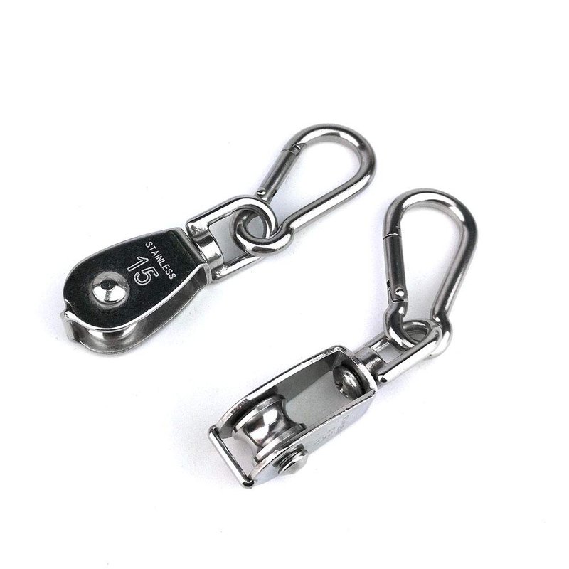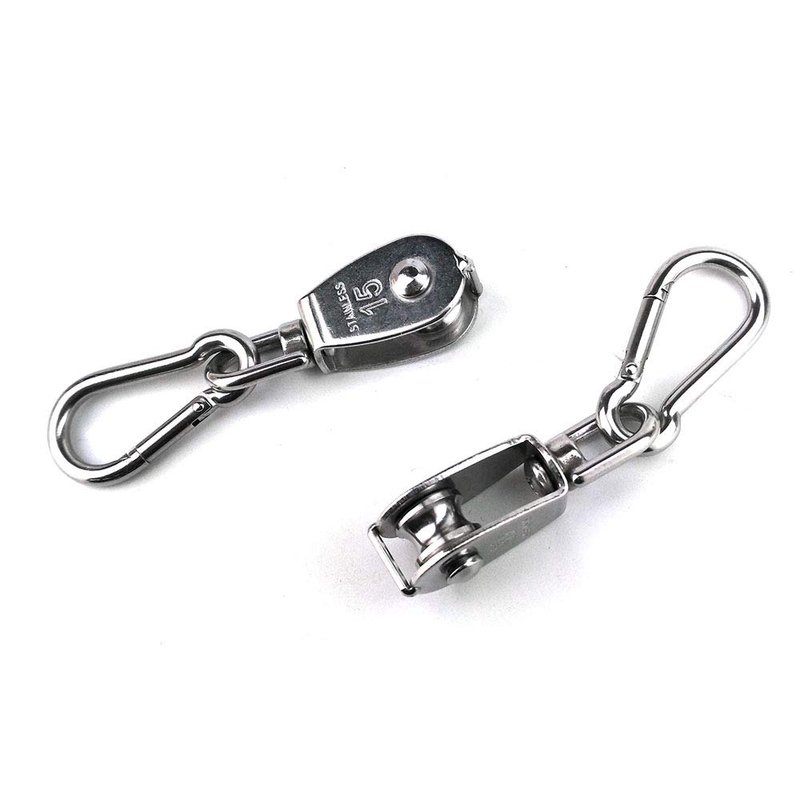 - Packaging includes:2 PCS Stainless Steel Pulley, 2 PCS Stainless Steel Spring Snap Hook