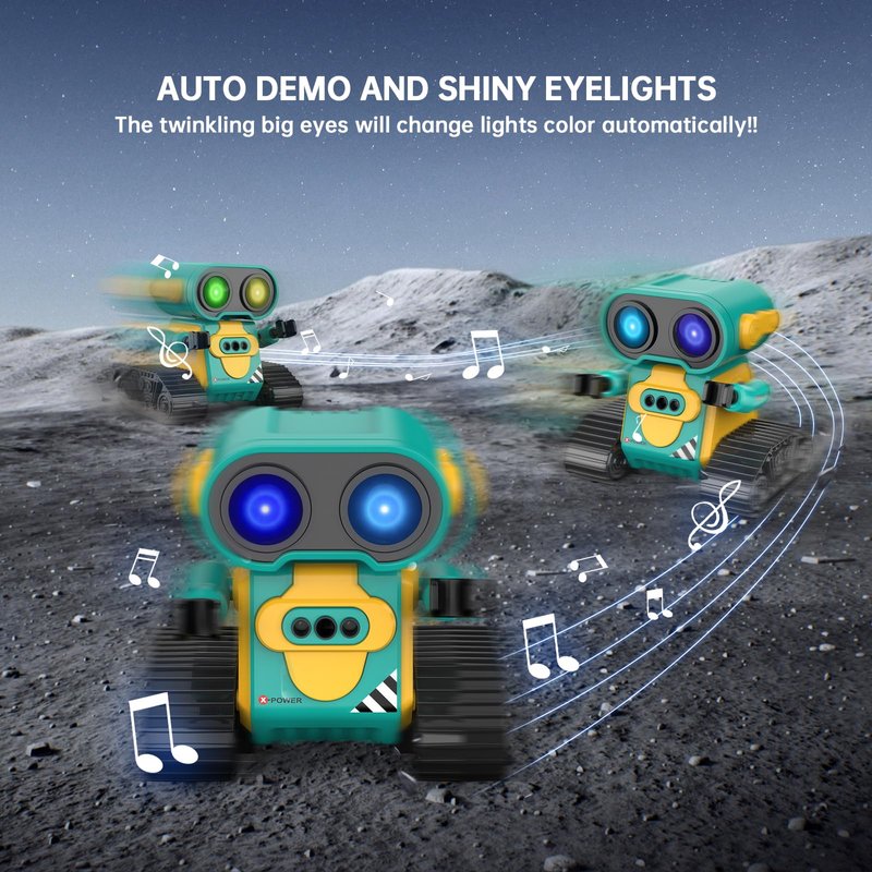 - Fantastic Unique Appearance: This cute and funny robot is designed in 3 parts. The upper part is a cute robot with a pair of funny big eyes and the arms are flexible. You can even put something in its hands to make it look cooler!! Flexible and durable large wheels allow the robot to move forward backward left, and right flexibly. Songs singing will absorb your baby. Combining a cute appearance, beautiful big eyes, flexible limbs, and a smart voice function, your baby will love this toy robot.