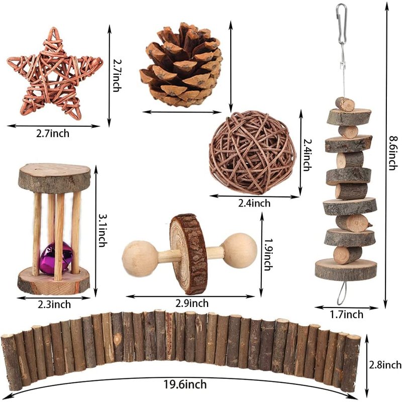 - 【FUN GUINEA PIG TOYS】The guinea pig chew toys set includes 1 Long climbing ladder suspension bridge, 1 willow hamster ball toy, 1 willow branch star toy,1 bell roller, 1 pine cone, 1 unicycle and 1 apple branch molar string. Pefect rodent cage accessories.