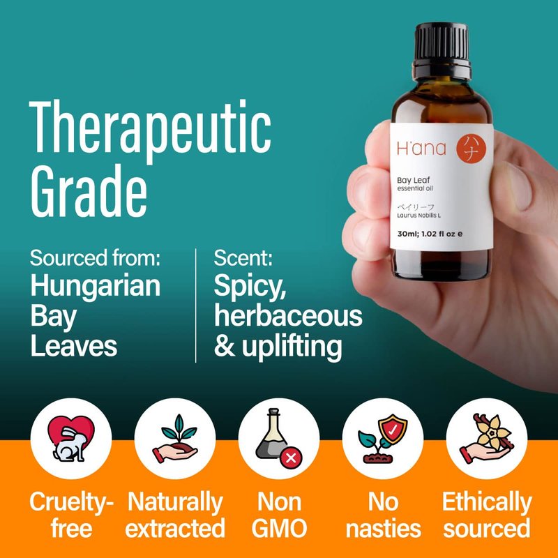 H’ana Bay Leaf Essential Oil for Diffuser - Oil Bay for Hair - 100% Natural Bay Laurel Essential Oil - Bay Leaf Essential Oils are Spicy, Herbaceous Scent (1 fl oz)