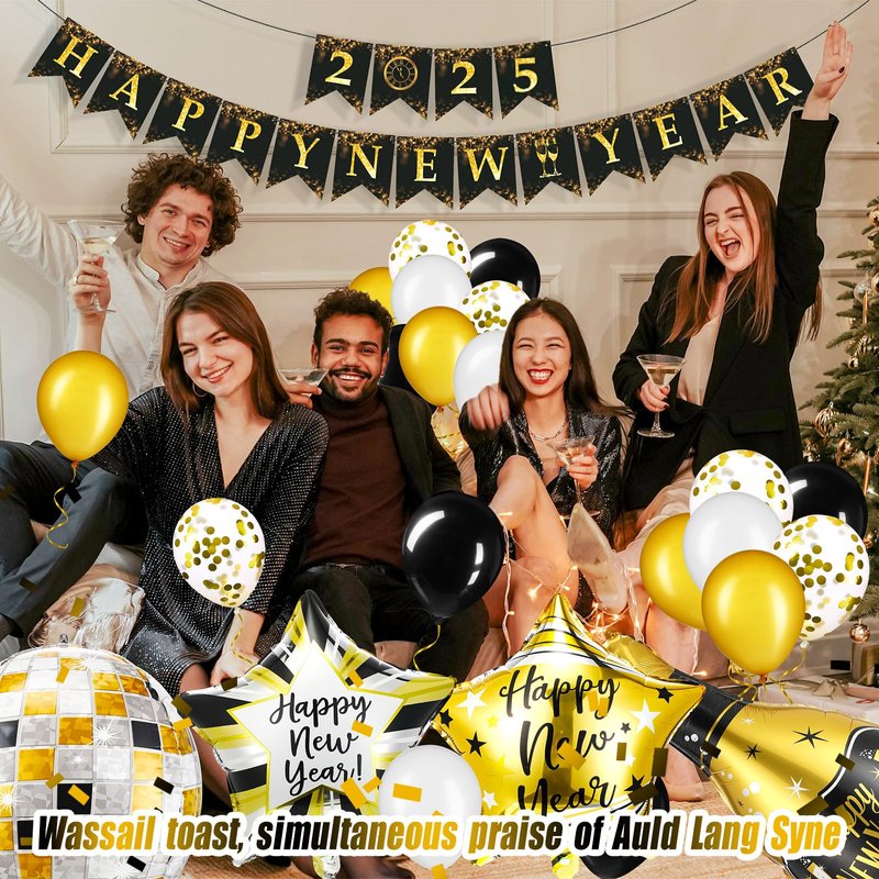 - Happy New Year Decorations 2025 Kit: the package contains 32 pieces of 12 inch latex New Years Eve party balloons in 4 styles (8 pieces per style), 2 pieces of 22 inch foil disco balloons, 4 pieces of 18 inch foil star balloons in 2 styles (2 pieces per style), 1 piece of 38 inch foil champagne bottle balloon, 1 set of 3 pieces 2025 happy New Year banners, and 1 roll of gold ribbon, a nice set for you to decorate your New Year party