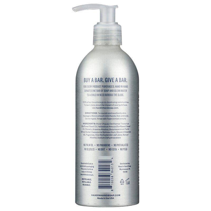 Vegan. Sustainable suds. Palm oil free. No palm oil. No parabens. No phthalates. No SLS/SLES. No BHT. No EDTA. No PEGS. handinhandsoap.com. Buy a Bar. Give a Bar: For every product purchased, hand in hand donates one bar of soap and clean water to a child in need across the globe. 100% of our donations go to developing communities. To learn more about the impact of your purchase, visit handinhandsoap.com. Sustainable Suds in sustainable packaging. This pretty bottle is made of infinitely recyclable aluminum. Recyclable. Refillable. Reusable. Infinitely recyclable. Cruelty free. Made in the USA.