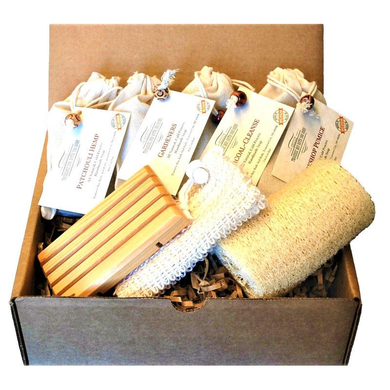 Great gift box for you or a great friend. Your Choice of 4 all Natural Handmade soap with 100% pure and certified essential oils and healing botanicals. (Four) 4.5 to 5 oz bar, with a 100% Cotton Bag With Cord Drawstrings. label including all ingredients. One sisal soap bag great for keeping your soap dry between use. Our natural sisal soap pouch measures 6 by 4.5 inches. Sisal cloth is a natural fiber derived from the Agave plant, which is a member of the cactus family and native to Mexico. The strong, extremely durable sisal fiber is 100% biodegradable. The attractive drawstring closure keeps the bar of soap secure. Your soap will lather more, and secondly your skin will be exfoliated as you cleanse. One Wood soap dish Extend the life your soap with this high quality soap dish. Each soap dish is handcrafted from Hard Wood. Excess water drains from bar of soap, while the specially designed grooves allow air to circulate around the entire bar. One Natural luffa Natural loofah, Size 4" in length. Loofahs helps slough away dry, rough skin Use with your bar soap to remove dead skin cells, stimulates blood circulation and leaves your skin smooth.