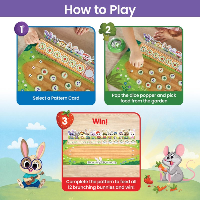 - RABBIT TOYS FOR KIDS: This set includes 1 Game Board, 1 Bunny Card, 3 Bunny Stands, 1 Mouse with Basket, 24 Pattern Cards, 36 Food Tiles, 1 Dice Popper, and an Activity Guide.