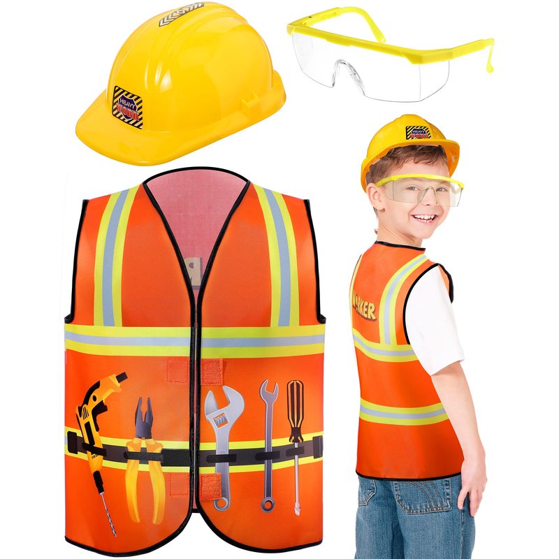 - Construction Themed Design: there's Work to Do! Break out the blueprints and head to the construction site in this Construction Worker costume. Boys and girls can pretend play and dress up for the imaginative job with these orange construction vests and yellow hard hats and goggles. They must be very excited