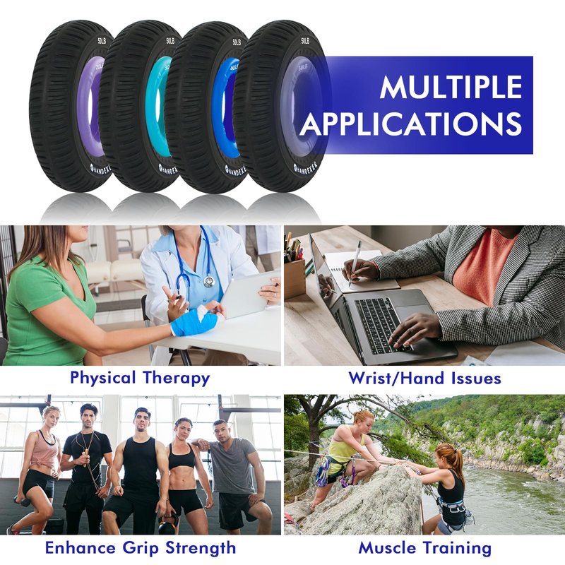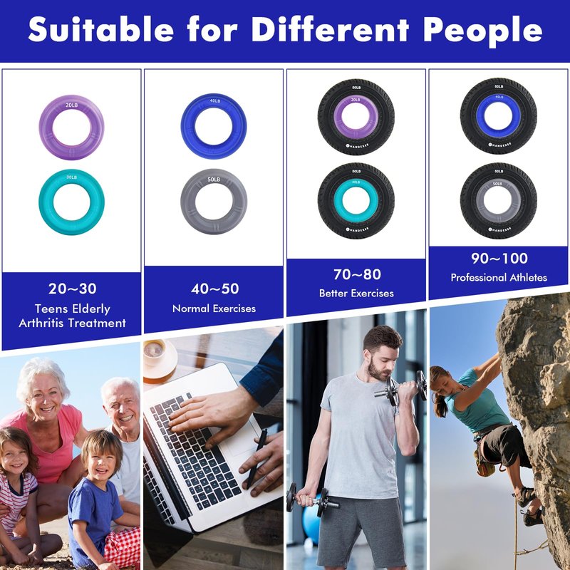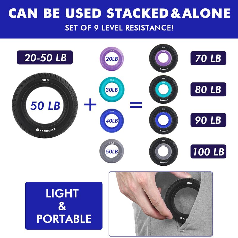 - 【SMART 2-in-1 STACKABLE DESIGN】 The Grip Set includes 5 Grip Strength Trainers: 20-50 lb. If you want a higher resistance level, let's stack the small ring into the big one, then these 2 rings are combined into a new higher resistance level. The Combination Grip Set can be adjusted to 70-100lb. Besides, the stackable design can save more space and is portable, just easy to put into your pocket or bag and carry around.