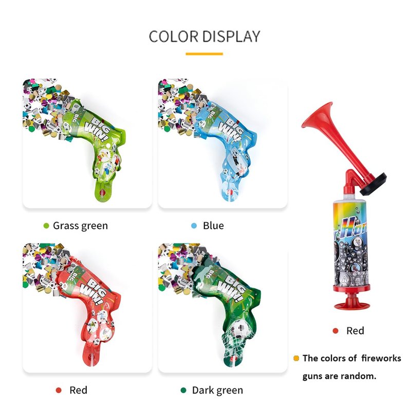 Compact and very convenient to carry to any venue you want, such as World Cup matches, football games, soccer games, parties, and any sporting events. Suitable for all age groups, and even young children would enjoy it as a great gift. The soccer-themed confetti design makes it stand out from other Fireworks Guns.