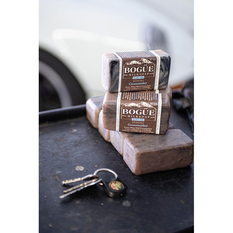 A hard working soap with 3 exfoliants, fine pumice to get in under the nails, ground walnut shell to scrub off grease and dirt, and cornmeal to remove odors. Essential oils of Petitgrain and Vetitver help remove lift grease and dirt while also soothing cut and abrasions making No.13 the ultimate mechanic or gardners soap. Bogue Milk Soaps are all made with natural vegetable oils and goat milk, and use only pure essential oils, infused oils and herbs for scent and skin nourishment. There are no artificial additives, preservatives, dyes or fragrances, and unlike commercial soap, all the glycerin created in the making of soap, stays in the soap. Goat milk has long been known for its moisturizing qualities. It's a natural emollient that soothes and moisturizes your skin and together with pure vegetable oils, produces a creamy, luxurious lather not found in commercial soaps.