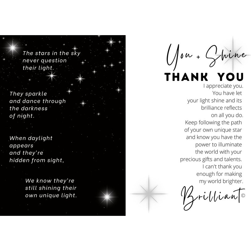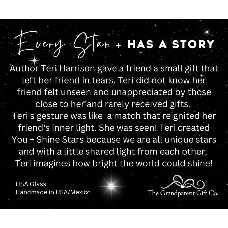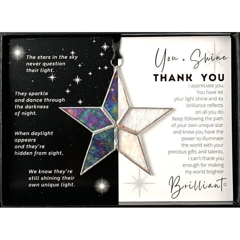 - Beautiful 4" ever-changing clear iridescent stained-glass star boxed with inspiring You + Shine Thank You message. A perfect way to show appreciation to someone who's been helping you along your way such as a teacher, neighbor, caregiver, pastor, good Samaritan, or friend.