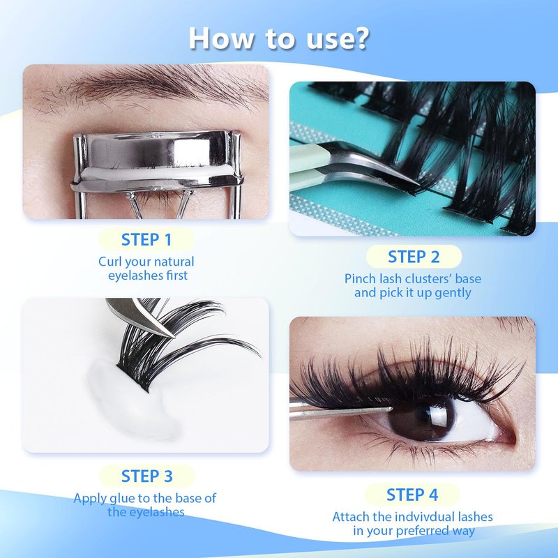 - 🌿🌿Easy to apply: step1,if you try to pinch the clusters off the strips ,Please use the tweezers to pick up the cluster lashes from the bottom instead of tips. step 2,apply the cluster lashes glue and wait about 30 seconds, step 3 apply the lashes on your upper or lower natural eyelashes. Do not touch your eyelid!