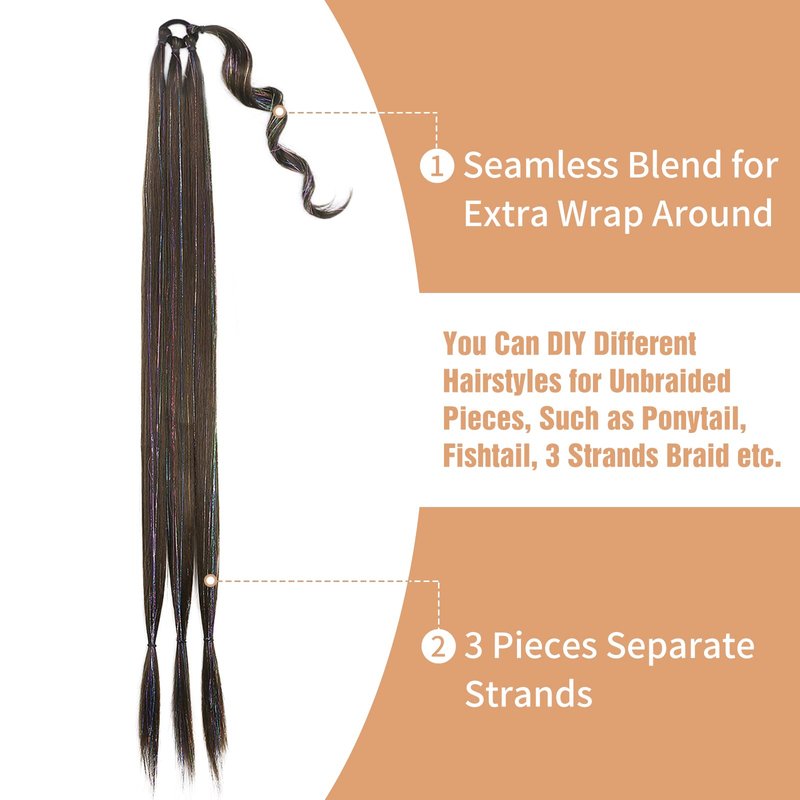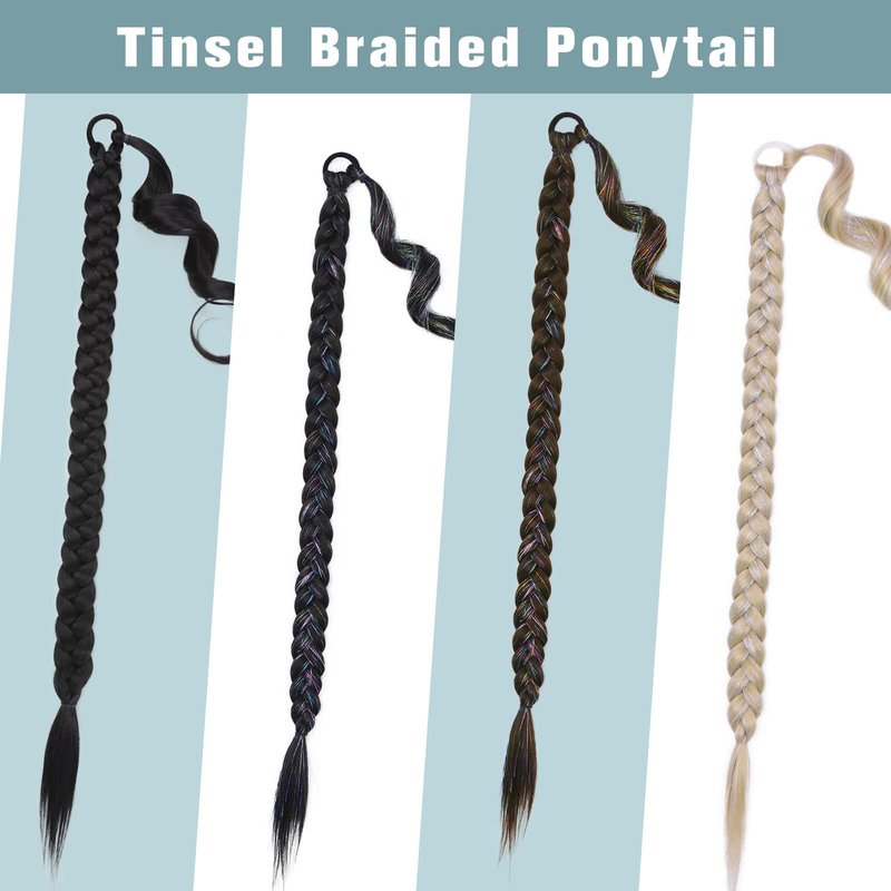 - Ponytail Length: 34 inches long tinsel mixed braid ponytail extensions with colorful tinsel hair, An extra strand of hair can be seamless connection with your hair, more realistic and natural.
