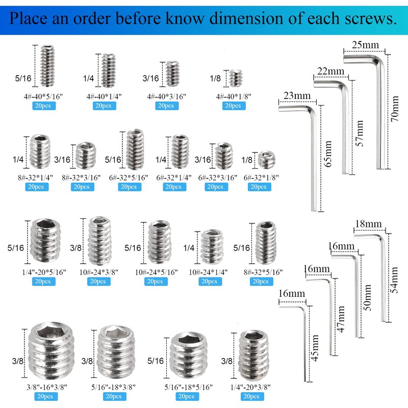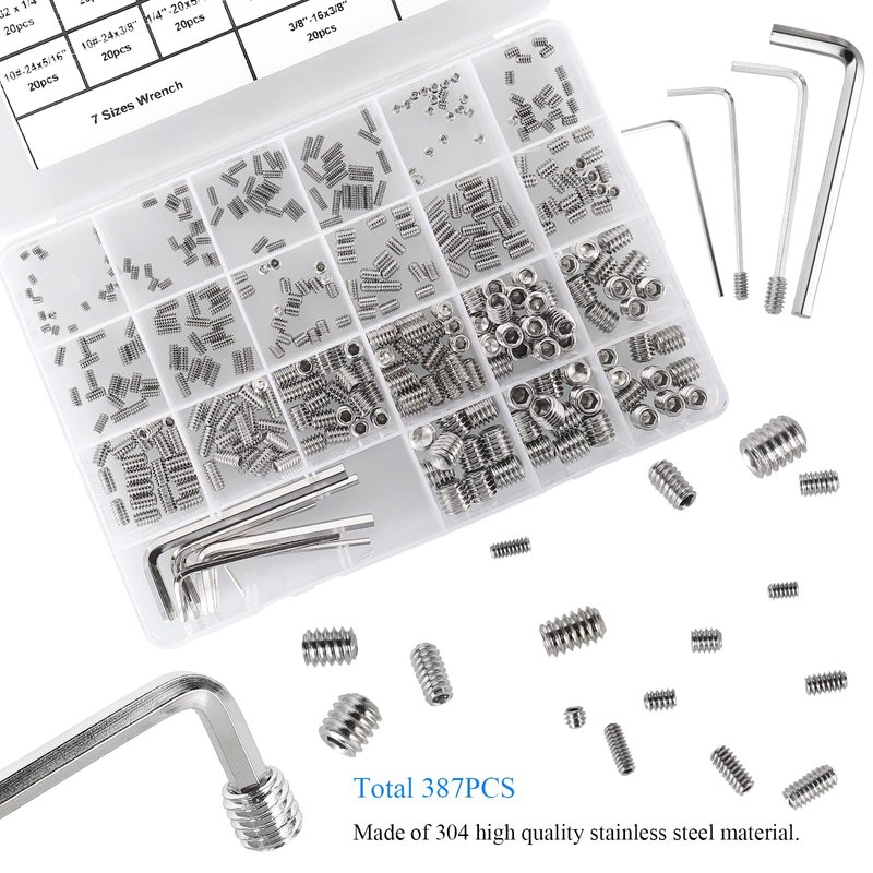 - 🔩【Set Includes】: 19 Kinds, Each Sizes 20pcs, Total 380pcs UNC #4-40 , #6-32, #8-32, #10-24, 1/4"-20, 5/16"-18, 3/8"-16,Standard SAE Allen Head Set Screws Assortment Kit with 7pcs Hex Wrenches,different sizes can meet your different needs.