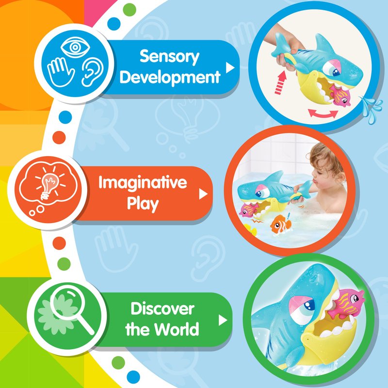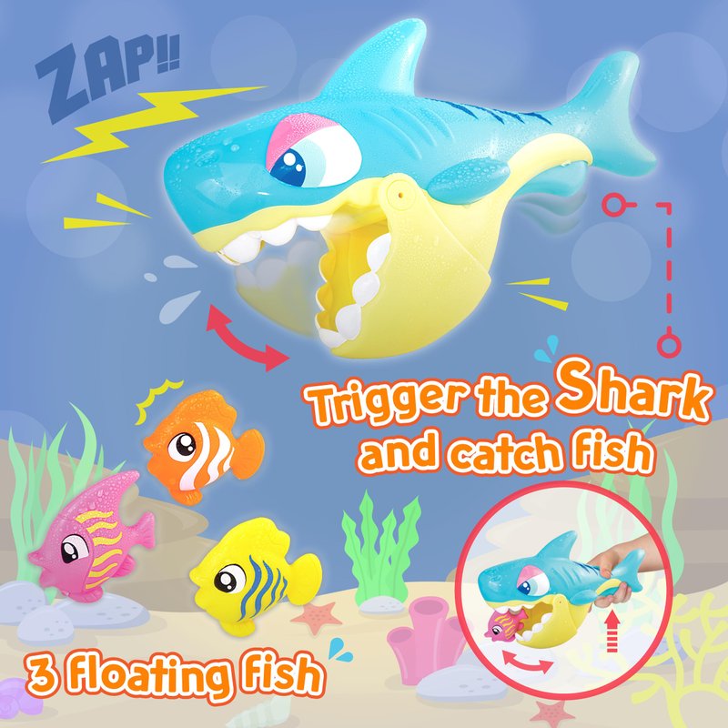 - 【TURN BATH TIME INTO A FUN ACTIVITY】Three fish float in water and swim. Press the trigger on Shark to open its Jaw and catch your fish.