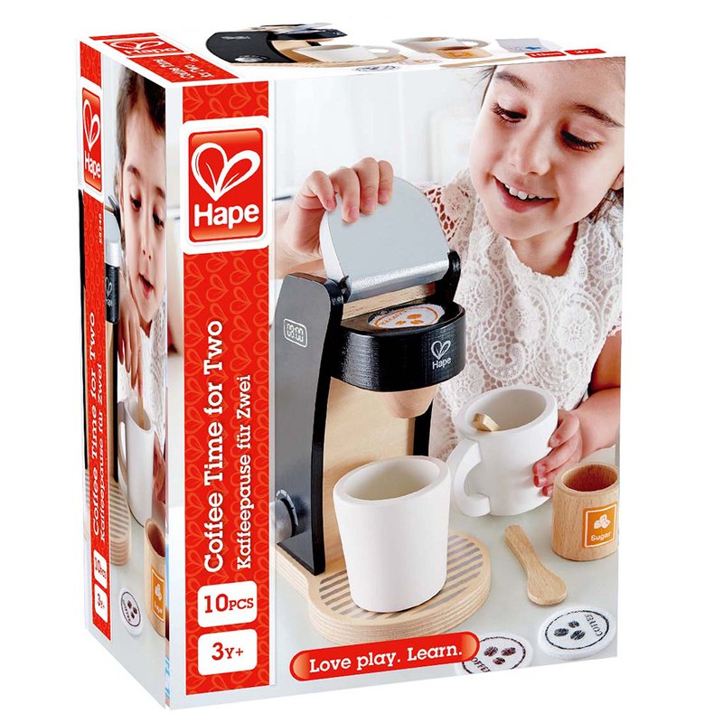Hape Wooden Black Coffee MakerThis fun wooden playset has everything a kid needs to make coffee in their play kitchen. This pretend coffee maker toy comes with one wooden toy coffee maker, two mugs, three felt coffee pods, two spoons, milk, and a sugar bowl. The Hape wooden coffee maker toy encourages kid's motor skills, role playing, and creativity with its realistic detail. With the Playfully Delicious Coffee Maker Play Set from Hape, great coffee is only a push of a button and a little imagination away. This brightly painted coffee maker is the perfect addition to any play kitchen where little bakers and chefs are at work.The Hape PromiseHape is a world-leading educational toy brand. We endeavor to develop children’s learning spirit through playing experiences and prepare them for the better world ahead. Hape Toys is one of the world’s largest producers of wooden toys. All of the products meet the strictest international standards for quality and safety. Hape Toys represent the next generation of play.Wooden Toy Maintenance MethodThe surface of the product is made of safe and water-based paint, which does not need to be disinfected. It can be dissolved in water. Do not use alcohol to wipe, do not wash, just wipe gently with a dry and wet cloth!