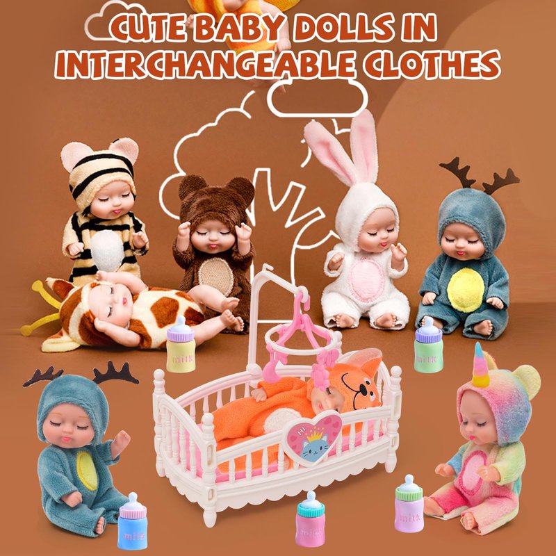 - EXCITING COMBINATION: You'll get 12 PCS 4 inch reborn baby dolls dressed in different cute animals outfits, each tiny baby doll is unique, rabbit, bee, bear, giraffe, elk, tiger, cow, fox, unicorn, dinosaur, sheep and panda, each one comes with a small colourful feeding bottle. The variety of shapes will make your children's eyes pop.